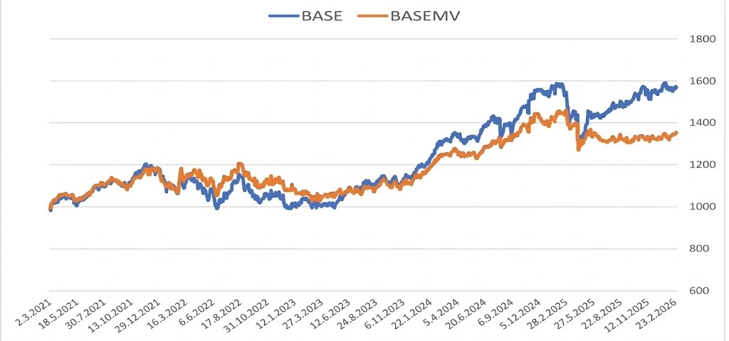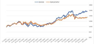 Vývoj portfolia BASE a portfolia BASE MV (MV – minimum volatility) v měně CZK 📊